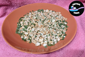 - Mix together the crushed nuts and 1.5 Tablespoons of freeze-dried chives. Spread on a plate or flat surface